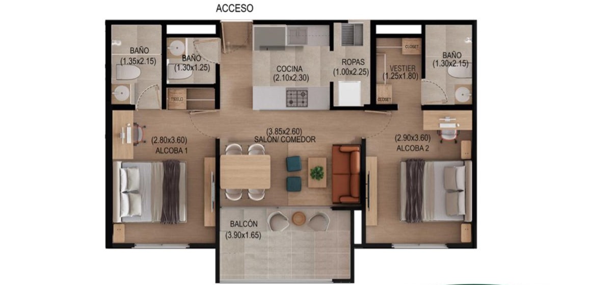 - Dormitorios: 2