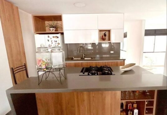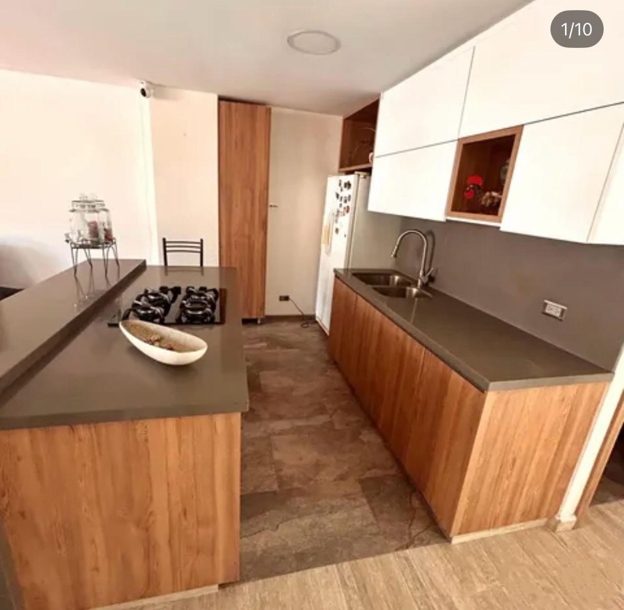 Cocina tipo isla con 2 mesones en piedra cuarzo. (Conexión a gas)